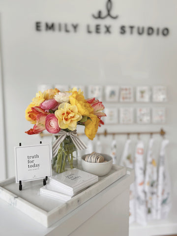 The shop is filled with all the pretty emily lex studio goodies you can find online - books, notecards, art prints, watercolor workbooks, truth for today cards, stickers - plus a few in-store exclusives.