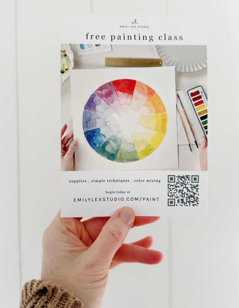 A free watercolor mini-class from Emily Lex covering supplies, simple techniques, color mixing, and everything you need to get started. Great for beginners and students of all ages.